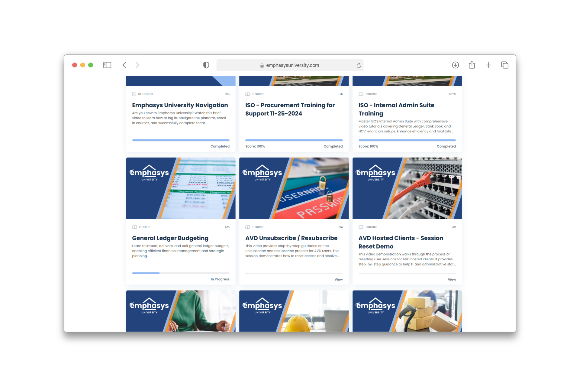 Emphasys University supports this reality by allowing staff to revisit critical workflows in small, focused moments, whether during a commute, between tasks, or when questions arise in the flow of work. This makes learning continuous rather than event‑based and reduces reliance on scheduled sessions alone.